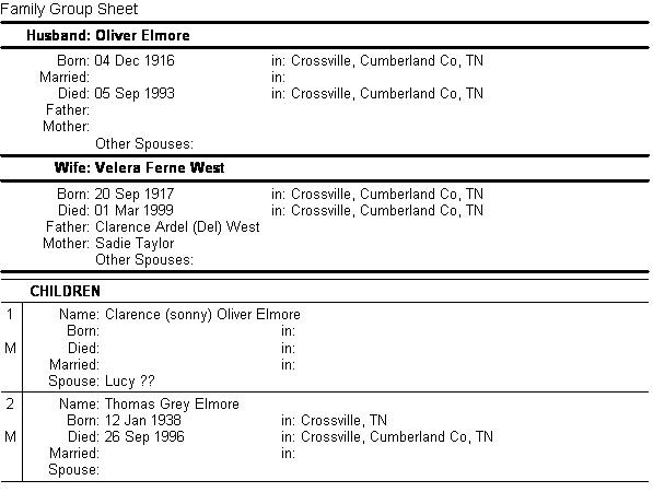 Crossville Chronicle - March 10, 1999 --VELERA FERNE ELMORE --Funeral services for Velera Feme Elmore, 81, of Crossville, who passed away March 1,1999, were held March 4 from the chapel of Bilbrey Funeral Home, with burial in Crossville City Cemetery. The Rev. George Long officiated, with eulogy by Clarence Elmore. She was born Sept. 20,1917 in Crossville, the daughter of Clarence Ardell West and Sadie Taylor West. Mrs. Elmore worked in the war effort in Oak Ridge, TN, and at the hosiery mill in Crossville. She was of the Protestant faith. Survivors include her son, Clarence Oliver Elmore of Crossville; daughter-in-law, Lucy Elmore of Crossville; three grandchildren; four great-grandchildren; and sister-in-law, Sue West. She was preceded in death by her husband, Oliver Elmore; son, Tom Elmore; brothers, Jack and Wallace West; and sister, Bernice Martin. Pallbearers were Gordon Hedgecoth, Ernest Neal, Steve Tabor, Clark West and Bob Donnelly. Bilbrey Funeral Home was in charge of the arrangements.
