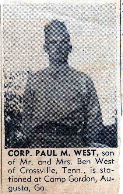 Crossville Chronicle, Date unknown - Corporal Paul West, second son of Mr. and Mrs. Ben H. West, enlisted in the Army in August, 1940,at the age of 17. His basic training was had at Ft. Benning, Ga. His marriage to Miss Lula Bruce took place on July 5, 1942. He is now stationed with a motorized division at Camp Gordon, Ga.