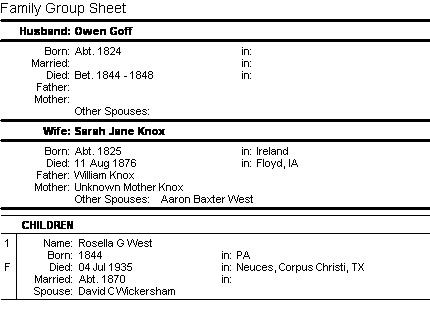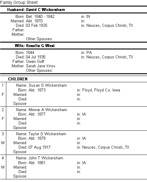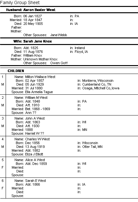 AARON BAXTER WEST AND SARAH KNOX-GOFF-WEST Aaron Baxter and Sarah Knox West were the parents of Milton Wallace West. They had four sons and two daughters but I (Marilyn Bishop-West) have been unable to locate any names except Milton Walace West and his brother C.W. West who lived in Maple Wood, Wisconsin in 1919. Sarah Knox had at least two brothers Silas Knox and Mathew Knox who was born in Pennsylvania in 1839. Sarah Knox was married to Owen Goff first and they had a daughter Rosa Goff who married David C. Wickersham. David and Rosa moved from Mason City, Iowa to Crossville, Tennessee in 1887. They moved from Crossville to Corpus Cristi, Texas sometime around 1900. -- from the notes of Marilyn Bishop-West