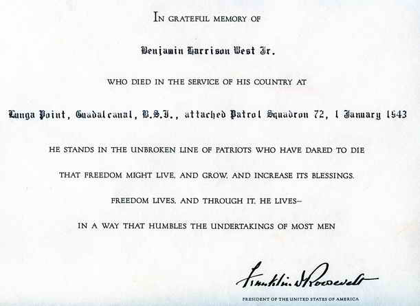 Department telling of the death of their son Benjamin Harrison West, Jr.,
