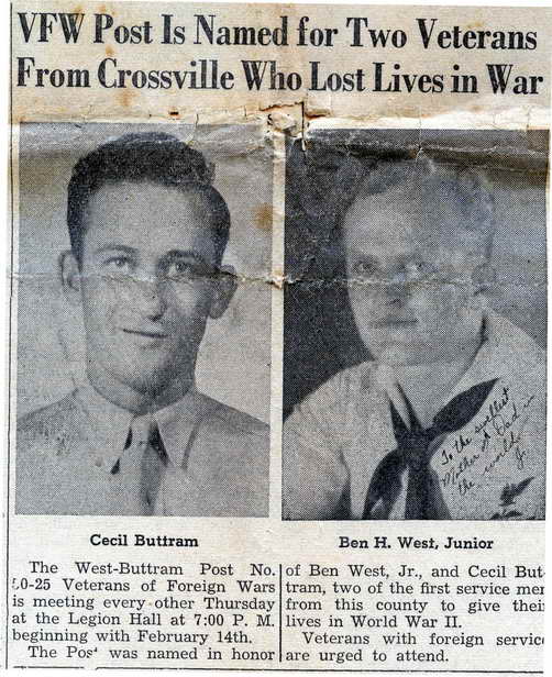 Crossville Chronicle, Date Unknown 1948, BEN H WEST JR, COUNTY’S FIRST WWII CASUALTY IS RETURNED FOR SERVICES HERE ON SUNDAY – West-Buttram Post 5025, VFW., American Legion And Masonic Lodge to Conduct Burial Service. -- The remains of Ben H. West, Jr., accompanied by a military escort, will arrive Saturday, Feb. 28, from Atlanta General Distribution Depot, for last rites to be held here. Arriving by rail at Rockwood the remains will be brought directly to the family home here, to lie in state until shortly before the funeral hour. These services are scheduled for Sunday, Feb. 29 at 1:30 p. m. in the First Christian Church, of which he was a member. Connor R. Lundy will officiate and be assisted by Rev. Thomas Burkett, of Rockwood. Bilbrey Funeral Home will be in charge. Crossville Lodge No. 483, F. & A. M., will give their impressive indoor service at the church. Assisting with the tribute to the deceased, will be the regular ceremonial of burial of the Veterans of Foreign Wars given by members of the local post, at the grave, assisted by members of the Cumberland County Post of The American Legion. The West-Buttram Post 5025, Veterans of Foreign Wars, was 'named for Ben Jr. and his school and classmate, Cecil Buttram, son of Mr. and Mrs. A. J. Buttram, Cumberland Homesteads, who was rep_orted missing in action in the North African Area as of Jan. 11, 1943, the tenth day after Ben had given his life in the crash of a naval plane at Lunga Point on Guadalcanal in the South Pacific Area. Ben Jr. was this county's first casualty of World War II; while Cecil was the second, in an honor roll numbering more than 65, who gave this county as home and who made the supreme sacrifice for their country during the recent conflict. His parents had planned to abide by his last wishes, that he be buried where he fell, which was agreed upon by all the crew of which he was a valuable member, but the .cemetery there was not a permanent one. So they felt that as long as he had to be moved at all, the best thing to do was to bring him home.