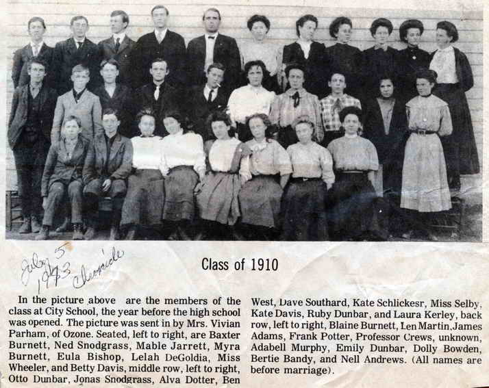 Crossville Chronicle, reprinted in 1975, Looking Back from 1910 - In the picture above are the members of the class at City School, the year before the high school was opened. The picture was sent in by Mrs. Vivian Parham, of Ozone. Seated, left to right, are Baxter Burnett, Ned Snodgrass, Mable Jarrett, Myra Burnett, Eula Bishop, Lelah DeGoldia, Miss Wheeler, and Betty Davis, middle row, left to right, Otto Dunbar, Jonas Snodgrass, Alva Dotter, Ben West, Dave Southard, Kate Schlickesr, Miss Selby, Kate Davis, Ruby Dunbar, and Laura Kerley, back row, left to right, Elaine Burnett, Len Mar tin, James Adams, Frank Potter, Professor Crews, unknown, Adabell Murphy, Emily Dunbar, Dolly Bowden, Bertie Bandy, and Nell Andrews. (All names are before marriage).