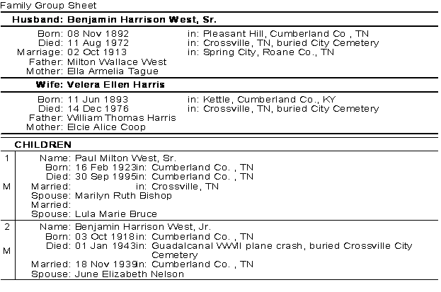 Crossville Chronicle, December 16, 1976, MRS VELERA ELLEN WEST, 83, a resident of Cumberland County for the, past 64 years, passed away at the Cumberland Medical Center, Tuesday, December 14th. She made her home on Route 3. Mrs. West was born June 10, 1893 in Cumberland, Kentucky. Funeral services will be held today (Thursday) at 10 a.m. in the Chapel of Bilbrey's with Reverend Joe Nickell speaking the final rites. Burial will follow in the City cemetery with members of the Masonic Lodge No. 483 serving as pallbearers. Mrs. West is survived by one son, Paul West, Sr., Crossville; three grand children and three great grandchildren, two sisters, Aileen Garmaney and Bill Harris, both of Atlanta, Georgia and one brother. Bilbrey Funeral Home in charge of the arrangements. Buried December 14, 1976.